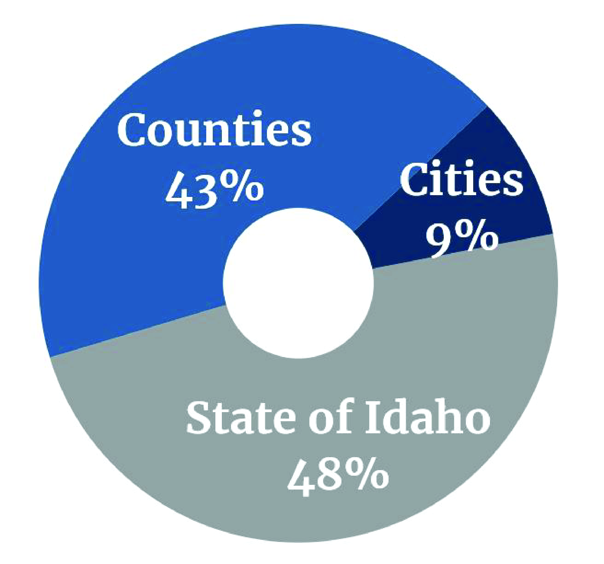 Funding Idaho courts is a shared responsibility. Approximately 47.9% of total court fines and fees go to counties and the state to help fund the courts. Other court funding sources include General Fund appropriations, sales and property taxes, and federal grants. Idaho counties reported $164.9 million in revenue for court-related funds in FY2023*.